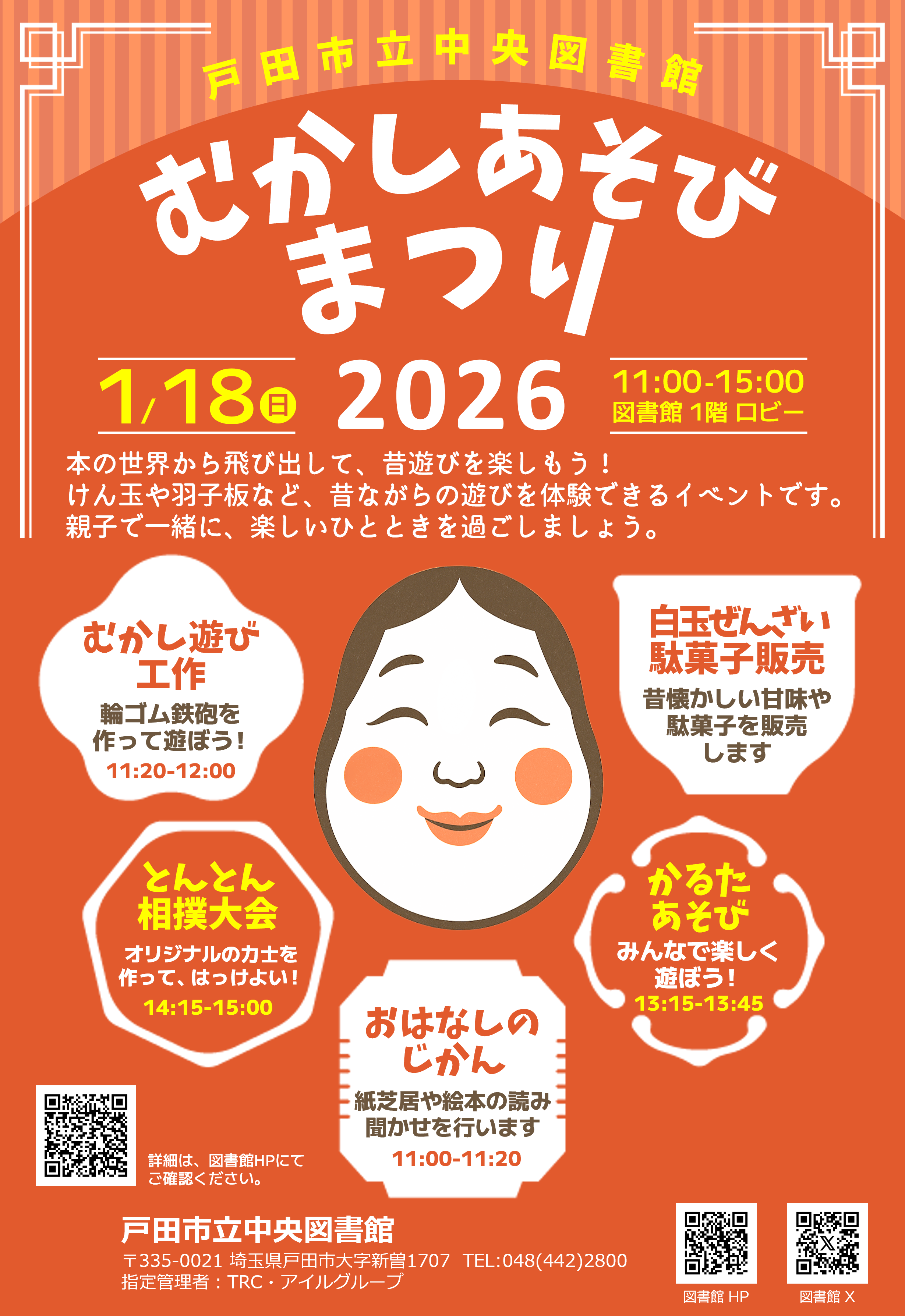 本の世界から飛び出して、昔遊びを楽しもう! 寒い日食べたい白玉ぜんざいと昔懐かしい駄菓子の販売も予定してます。 |