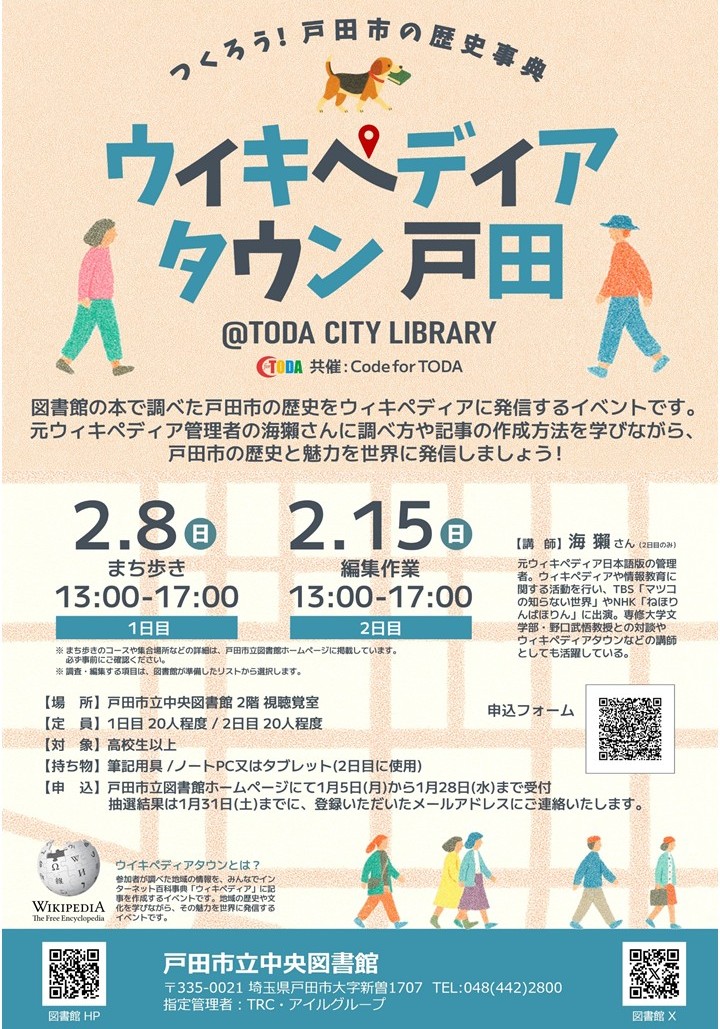 図書館の本で調べた戸田市の歴史をウィキペディアに発信するイベントです。 1日目は市内街歩きなどを中心とした活動。 2日目はノートPCなどを使った編集作業を行います。 どちらか片方だけでも参加可能です。 |